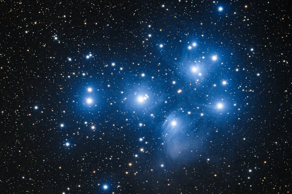 11 Die Plejaden M 45 Die Plejaden M 45, auch als Siebengestirn bekannt. Es handelt sich um einen offenen Sternhaufen mit insgesamt mehreren hundert Sternen. Die Sterne strahlen in der Nähe befindlichen interstellaren Staub an, der als bläulicher Reflexionsnebel sichtbar wird. Die Plejaden sind auch mit dem bloßen Auge ein auffälliges Objekt am Winterhimmel und werden aufgrund der ähnlichen Form manchmal mit dem Sternbild des Kleinen Wagen verwechselt. Der griechischen Sage nach stellen die hellsten Sterne die sieben Töchter des Atlas dar.